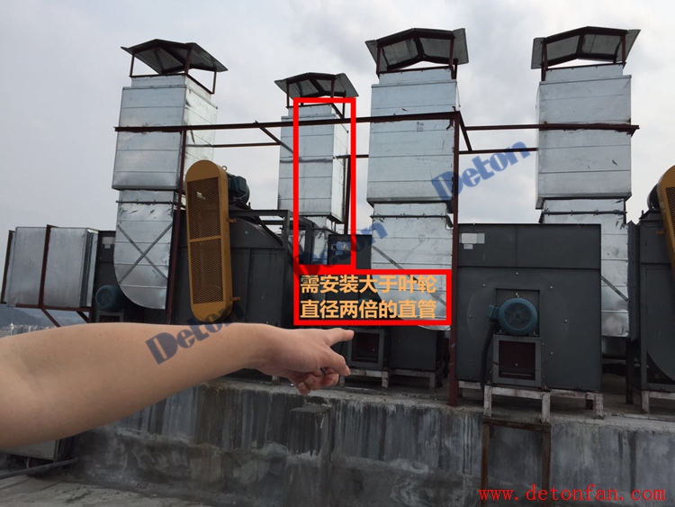 小分隊(duì)糾正:彎頭距離風(fēng)機(jī)出風(fēng)口直管的長度最好是葉輪直徑2倍,但是最小不能少于1.5米,此圖需安裝直管拉開與風(fēng)機(jī)的距離。